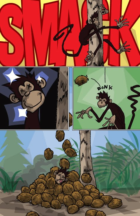 Ben [Glibert] was aiming for a straight up comedy, my first outlines were dark and rather grungy — violent, even. Then we had a long talk, during which I consumed several scones that had a consistency similar to metal (but they still tasted great, because it’s not about the texture…I digress). What we ended up discussing changed my perspective of the character and the setting. I realized that the jokes didn’t have to be deep or full of “great meaning.” The world could be the joke, sure, but at heart, Sim-I is still a monkey. If the joke literally involves slipping on a banana peel, or a love potion gone wrong (we are, after all, in a lab) then so be it. Just as long as Sim-I continues his search for an exit, then we’ve reached out goal. So, in a roundabout way of answering your questions, the tone of the material developed later, with time and through many iterations, to become accessible to all ages.