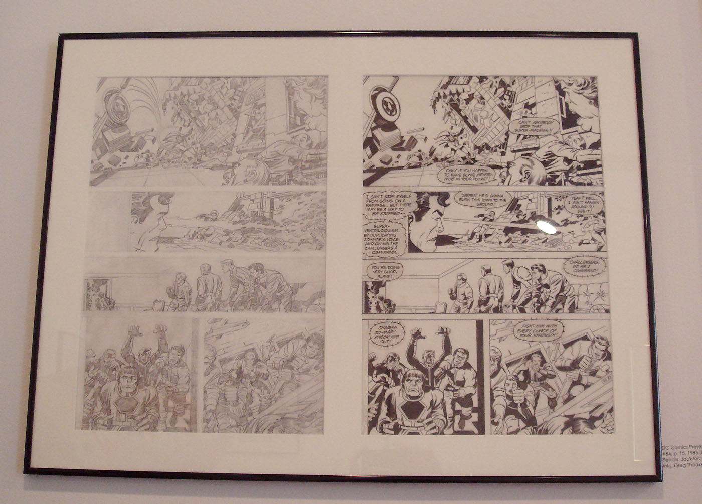 As explained in the exhibit, Kirby was known as the “King of Comics” to many. So much so that artists were reluctant to ink over his drawings because they were so in awe of his work. Above you can see an example of his original from DC Comics Presents #84 on the left and the inks on the right. Inker Greg Theakson did them over a trace of the original instead leaving Kirby’s work intact.